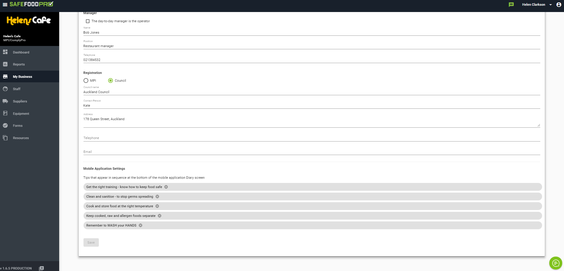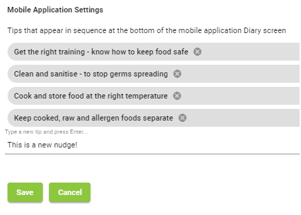 You can now customise the screen nudges shown below your Diary Checklist on your Mobile/Tablet. By default there are 5 Food Safety based nudges. These are displayed at the bottom of the Diary Checklist on your Safe Food Pro Tablet/Phone App and rotate between the nudges as you use the application.