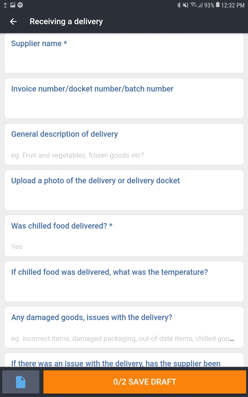 - Your delivery form should be already be in your daily diary on your Safe Food Pro App. If not you can find it in the Ad Hoc forms under 'Receiving a Delivery'.